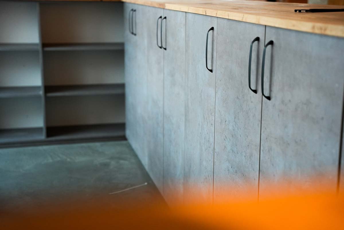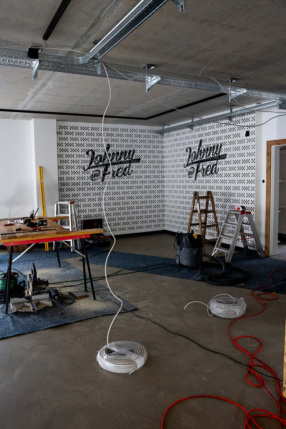 Die Arbeiten in unserem Neubau sind schon sehr weit fortgeschritten! Mittlerweile sind die Tischler mit der Inneneinrichtung beschäftigt und man kann bereits erste Ansätze des Innenraums erkennen, wie z.B. den Verkaufstresen oder die Umkleidekabine.
